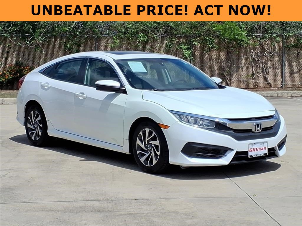 Gillman's Lifetime Engine Warranty lasts as long as you own your vehicle - free with the Gillman Pre-Owned Promise. If the vehicle isn't right for you, return it in purchase condition within 2 days or 200 miles as part of our Happy-Driving Guarantee. (Valid on vehicles under 90,000 miles and less than 7 years old). Discover the reliability and efficiency of the 2016 Honda Civic EX 4dr Sedan. Powered by a 2.0L I4 engine with a smooth CVT transmission, this Civic offers a comfortable and engaging driving experience. Enjoy modern features like a 7-inch touchscreen infotainment system with Apple CarPlay and Android Auto, Bluetooth connectivity, and HondaLink for seamless smartphone integration. Stay safe with a multi-angle rearview camera, blind spot camera display, and advanced safety features including traction and stability control, anti-lock brakes, and multiple airbags. The EX trim adds stylish aluminum alloy wheels, a power moonroof, push-button start, and automatic climate control for added comfort and convenience. Additional highlights include keyless entry, cruise control, split-folding rear seats for versatile cargo space, and LED daytime running lights. This Civic is the perfect blend of style, technology, and dependability-ideal for daily commutes or weekend getaways. Test drive it today and see why the Honda Civic remains a top choice for savvy drivers. All vehicles subject to prior sale. We are not responsible for typographical errors and may change information without notice. Photos may not depict the actual vehicle. Tax, title, and license fees not included. Dealer Discount available to all buyers.Vehicles purchased from Gillman Automotive Group include a Bring It Back Guarantee: return the vehicle in purchase condition within two days or 200 miles. New current-model-year vehicles and qualifying pre-owned vehicles (under 90,000 miles and less than 7 years old) are eligible. Guarantee is non-transferable and has no cash value. Lifetime Warranty available on select pre-owned vehicles. See dealer for details; restrictions may apply.
